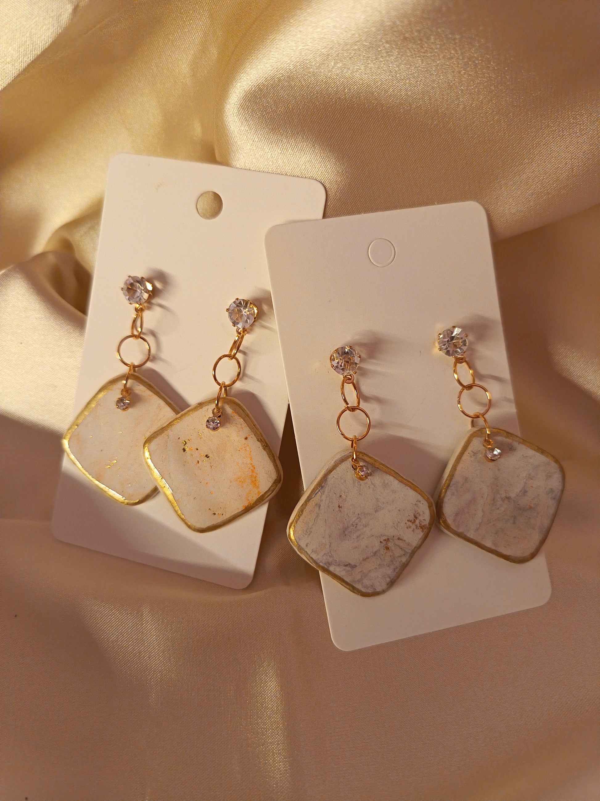 Orecchini artigianali in argilla con bordo oro , luminosi e raffinati, eleganza pura in una forma geometrica delicata